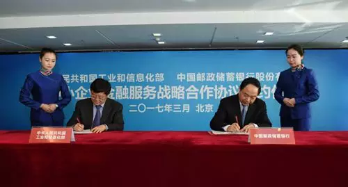 3月27日,工业和信息化部与中国邮政储蓄银行在京签署《中小企业金融服务战略合作协议》,工信部副部长徐乐江、邮储银行董事长李国华出席签约仪式并代表双方签署协议。邮储银行副行长邵智宝主持签字仪式。