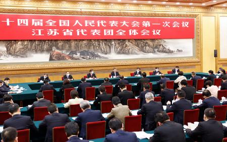 习近平来到江苏代表团,现场响起热烈掌声。