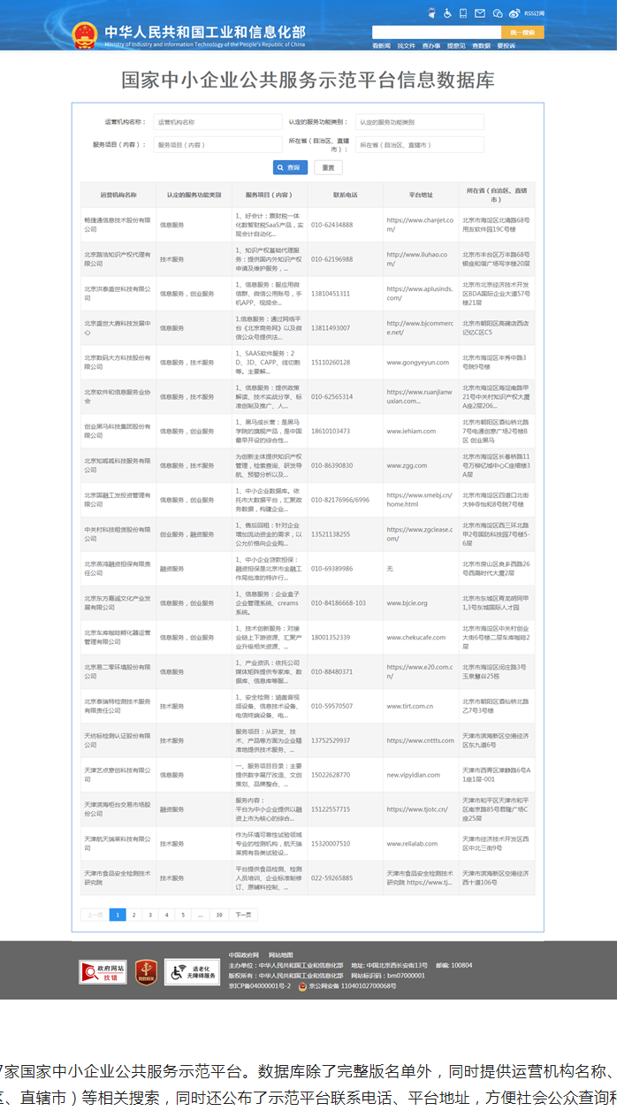 数据库包含767家国家中小企业公共服务示范平台。数据库除了完整版名单外,同时提供运营机构名称、服务功能、服务项目、所在省(自治区、直辖市)等相关搜索,同时还公布了示范平台联系电话、平台地址,方便社会公众查询和监督。